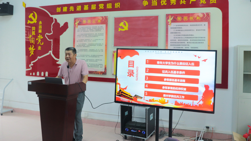首先,保卫处吴飚副处长解读征兵政策。他以“青年大学生为什么要参军”这一问题展开,指出参军是国防和军队建设的需要,也是个人成长的有效途径;“爱我中华,携笔从戎”,目前国际局势动荡不安,国家周边安全频发,国家安全仍面临严峻挑战,国家国防需要青年的加入。同时,吴处介绍了我校的征兵工作,2016年来,我校共有230多名大学生应征入伍,且部分优秀退伍军人考研考编考公成功,取得了个人良好的职业发展。此外,他详细讲解了大学生征兵入伍的要求、流程、政策优待等内容,重点就“两征两退”及重要的时间截点进行强调,并对大学生应征入伍的优待政策逐条详细解读,鼓励同学们强练体魄,通过应征入伍提高个人素质,丰富个人阅历。