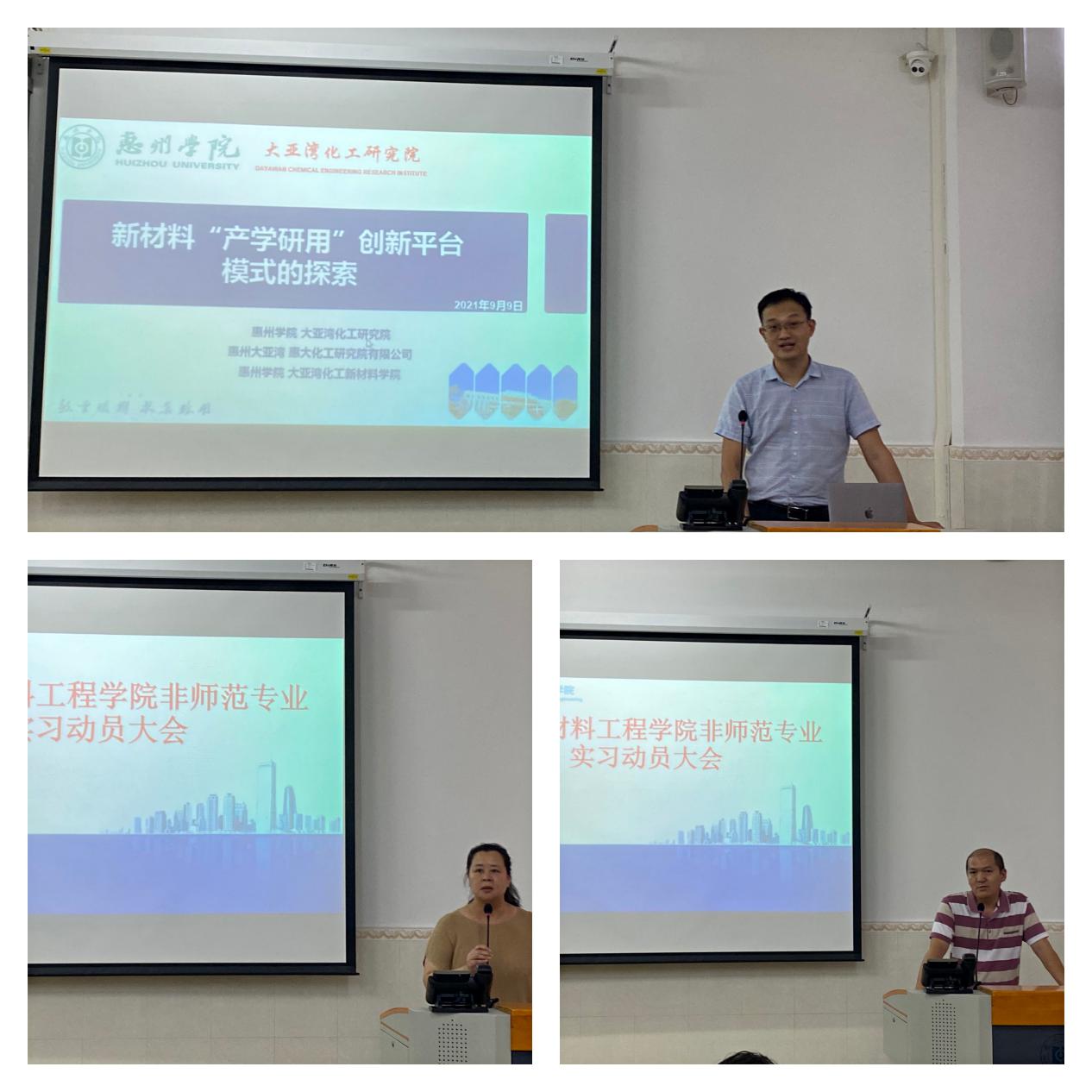 刁贵强博士通过照片向同学们展示了大亚湾研究院的工作内容及发展现状。他表示,在研究院实习的同学们应当遵守研究院的实习工作安排,每天进步一点点,不断学习,不断积累;随后各系主任向同学们提出了实习的建议与意见。高分子材料与工程专业的陈鸿雁主任重点强调了安全问题,叮嘱同学们在实习过程中一定要注意操作安全,出现异常情况一定要及时向指导老师反馈,切勿擅自操作,主动和指导老师沟通交流。应用化学系卢明主任介绍了不同类型企业的区别,嘱咐大家要在实习中不断了解自己,关注职业发展现状,为以后毕业工作做出合理的职业规划。化工系邱思主任强调同学们要保持良好的心态,抱着学习的态度去实习,遵守企业纪律,用长远的眼光看待实习,以积极饱满的工作态度投入到实习工作中去。