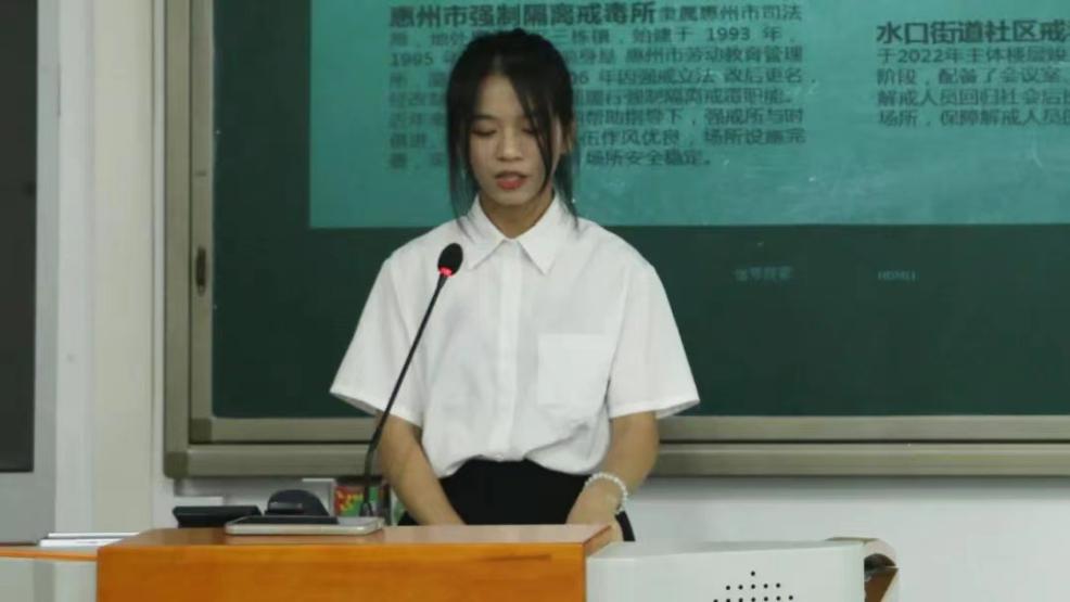 随后进行分享的是灿若星辰队,他们去到了惠州市强制隔离戒毒所和水口街道社区戒毒(康复)服务中心。团队在强戒所警官与社区工作人员的协同带领下,走进水口街道社区戒毒康复服务中心学习禁毒知识,并前往解戒人员家中回访,了解其解戒后的各方面状况。团队成员还通过一定的心理沟通,以尽可能地引导他们摆好奋斗姿态,积极进取,不断拼搏。以本次活动为契机,为我院学子增长课外知识以及提高实践能力增添一个全新的平台,有助于我院学生团队紧跟新时代禁毒战争的步伐,合作促进实践教育和专业教育,为社会培养高素质劳动和技能型人才。