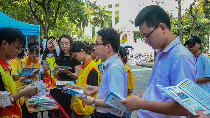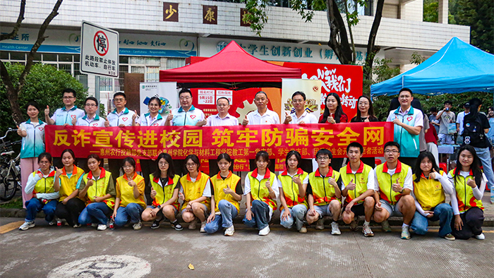 本网讯 为增强学生的反诈骗意识,杜绝不法分子有机可乘,9月26日下午,惠州农行投融部联合化学与材料工程学院教工第一党支部、学生党支部、团委学生会在少康楼前开展了以“反诈宣传进校园,筑牢防骗安全网”为主题的大学生反诈宣传活动。