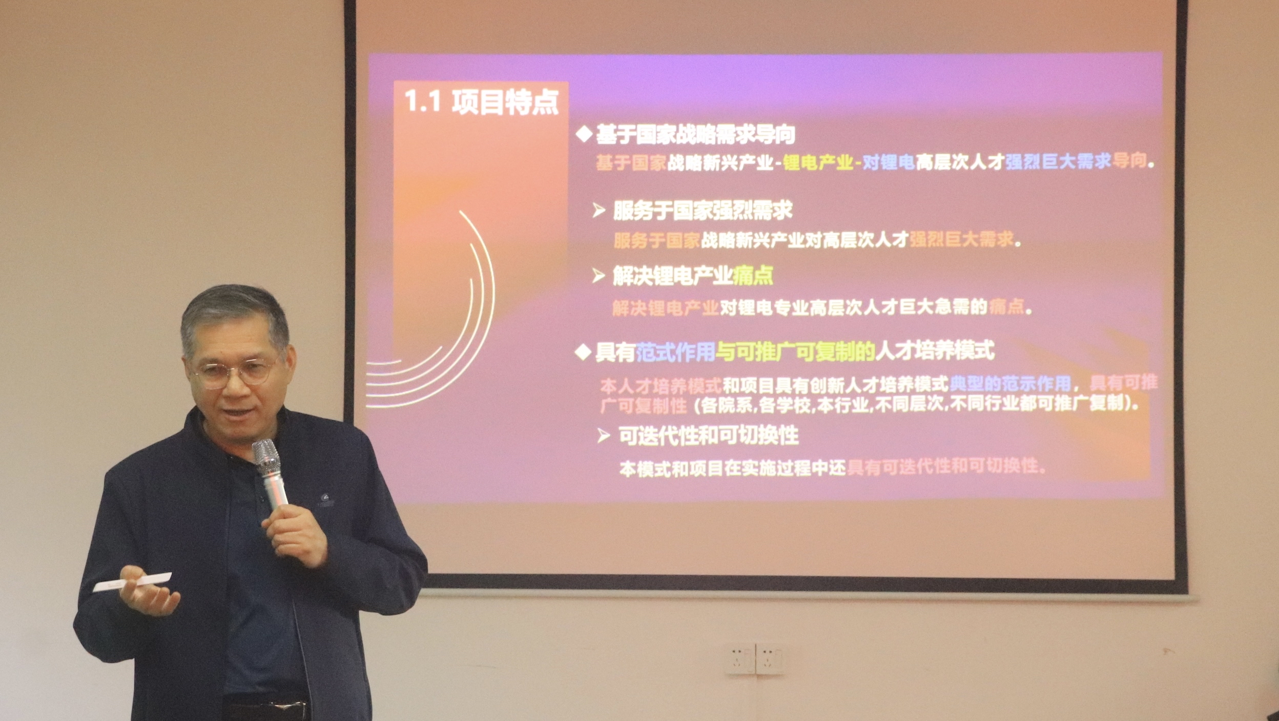 赵鸿斌教授做了“惠州学院-欣旺达电子股份有限公司-锂电卓越工程师高层次人才联合培养项目简介与发展规划”报告,详细介绍了项目特点、项目背景、项目开展目的、人才培养模式和过程等内容。他指出,为促进产教深度融合,满足国家对锂电高层次人才的强烈需求,创新培养模式势在必行。赵鸿斌教授还从学生、学校和企业发展的三个角度深入阐述了人才培养模式的特色和优势,有效实现了“学生得到了真正专业能力培养、获得好的发展平台、实现高质量就业,学校创新人才培养模式、培养出社会企业高度认可的人才,实现完成产教深度融合,企业获得真正专业对口的高质量的人才”三方共赢的局面。