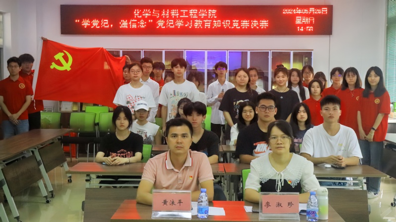 本网讯 为深化学生对党纪党规的理解和掌握,进一步加强学生党员的党性教育和纪律意识,化学与材料工程学院于5月26日下午在化工楼E-503举办“学党纪,强信念”为主题的党纪学习教育知识竞赛。出席本次活动的有学院党委副书记廖淑珍、第一学生党支部书记黄浪平及党员、入党积极分子代表。
