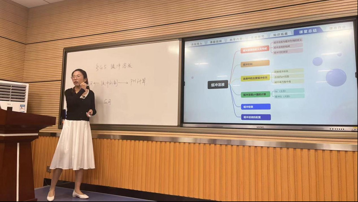 短短30分钟,李佳佳老师声情并茂地讲解了大学化学第四章“缓冲溶液”的相关内容和知识,从简到难、由浅入深,通过具体实例和生活案例分析讲解,将枯燥或是难以理解的概念都变得很生动、简单。期间,李老师通过“蓝印染”的制作过程,将思政教育引入课堂,不仅宣传中华民族几千年来的文化底蕴,也传递了匠人们的勤劳、不断创新的优良品质。此外,李老师将知识点衍生到生物、医学等前沿领域,实现了学科的交叉融合。整堂课下来,李老师语言委婉生动、重点突出,充分调动了聆听着的思维和探究的热情,充分贯彻了以学生为主体的教学理念,让在场老师记忆深刻,获益匪浅。