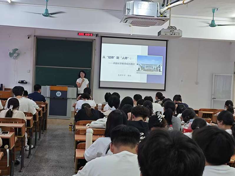 随后,杨琼副校长以“从‘经师’到‘人师’”为题作专题讲座。她从四个核心维度展开,阐释“卓越教师”的内涵与标准,分析学校与教师发展的共生关系,梳理卓越化学教师成长的“三部曲”路径,并重申教育工作者的初心与使命。讲座尾声,杨琼以“师者化穹庐,退守星河之畔;少年逐天光,自掌日月罗盘”勉励学子,引发广泛共鸣。