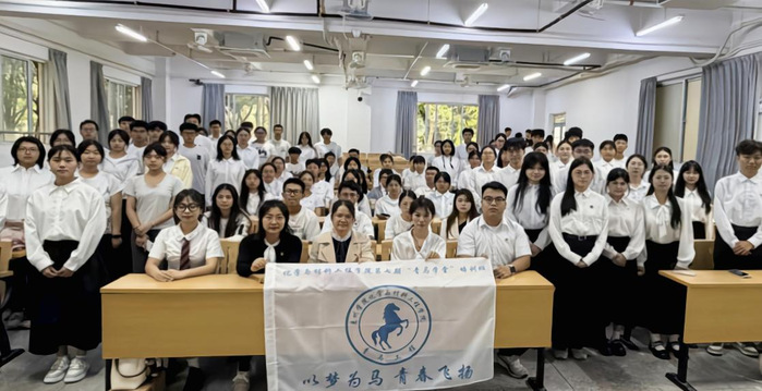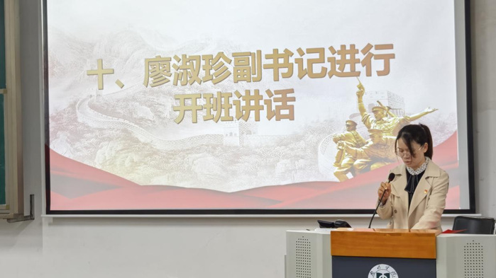 最后,廖淑珍为第七期“青马学堂”班主任授旗,并作开班动员讲话。她向获得荣誉的学员和班主任表示祝贺,对新学员表示欢迎。她指出,在学院党委的领导下,学院团委将持续完善“青马学堂”工作机制,加强课程体系建设,为学员提供更加丰富多元的学习资源与实践平台。她对全体学员提出三点希望:一要坚定理想信念,筑牢思想根基;二要坚持知行合一,勇于担当作为;三要注重团结协作,凝聚集体力量。她希望学员们通过“青马学堂”的学习,不断提升政治素养与理论水平,锤炼作风品格,增强学习力、思想力和行动力,努力成长为真正的马克思主义践行者。