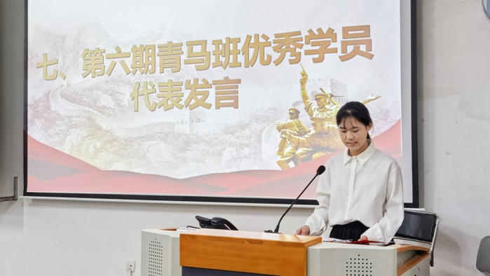 在分享环节,第六期学员代表井禹铮分享了学习体会。她表示,通过“青马学堂”的系统学习,自身综合能力得到显著提升,实现了从单一技能到系统素养的跨越,并立志在新征程中书写属于青年一代的青春篇章。第七期学员代表林耿楠在发言中表示,将坚定马克思主义信仰,扎实专业学习,积极服务社会,努力成长为有信仰、有担当、有作为的新时代青年。