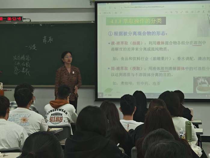 解芳老师以扎实的理论功底、清晰的授课逻辑和富有感染力的语言,深入浅出地讲解了“液-液萃取”这一化工单元操作的特点、分类和基本原理。她巧妙运用案例教学与启发式提问,将“固-液萃取”与“泡茶”、“液-液萃取”与“香精提取”等生活实例相联系,引导学生逐步理解萃取过程中的传质机理,课堂气氛活跃,学生参与积极。