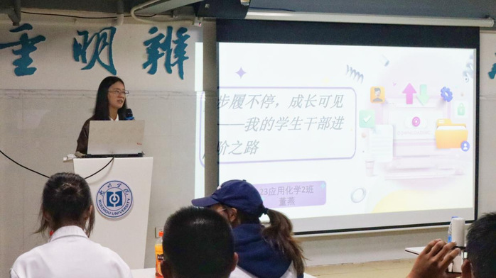 23应用化学2班董燕回顾了学生干部成长经历,称学生工作为一场“温暖的修行”,既促进个人成长,也点亮团队光芒。她提醒同学们要主动担当,在工作中锻炼沟通、抗压与复盘能力。在时间管理方面,她建议课堂高效学习、课后合理规划,实现学业与工作平衡;在心态调整上,应避免内耗,做到脚踏实地、放眼全局。