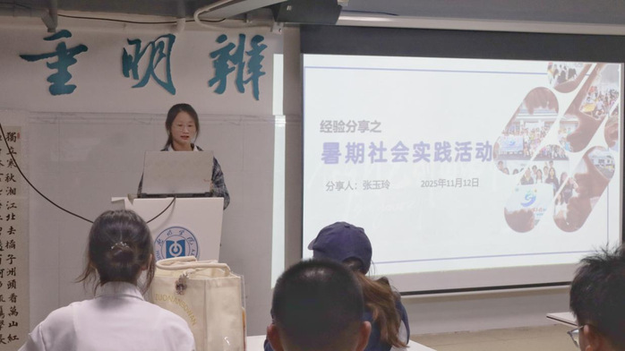 23化学1班张玉玲分享了社会实践活动的相关经验,涵盖前期准备、中期实施与后期总结答辩。她建议团队规模以6至10人为宜,选题应结合专业特色和时政热点,注重AI赋能与线上线下协同推广,并介绍了日常宣传、答辩总结等具体做法。她总结出选定赛道、寻找指导教师、加强团队协作等心得,鼓励同学们“敢想、敢试、敢闯”。