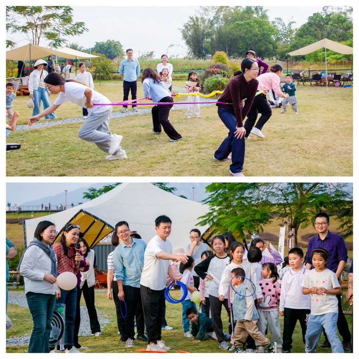 下午,趣味团建拓展活动在大洞山境营地展开。“东南西北跑”“赶鸡入笼”“套圈圈”等互动项目兼具趣味性与协作性,激发了大家的参与热情。教职工及家属们踊跃投入、默契配合,现场欢声笑语不断。新老教师在轻松愉快的竞技中迅速拉近距离,展现出学院教师团结协作、积极向上的精神风貌。