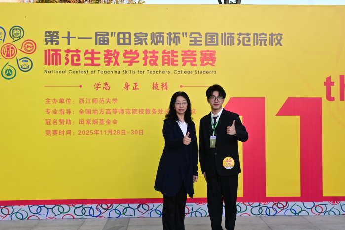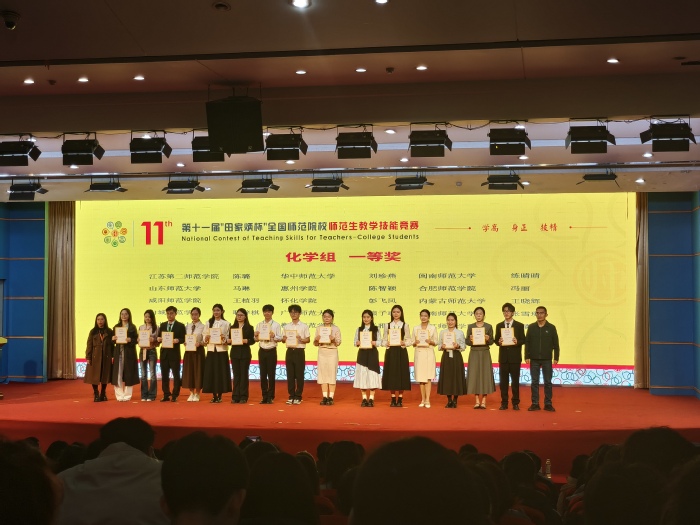 本网讯 2025年11月28日至30日,“田家炳杯”第十一届全国师范院校师范生教学技能竞赛决赛在浙江师范大学举行。化学与材料工程学院2022级化学专业陈智颖同学(指导教师:解芳、杨勇、王慧泽)表现出色,荣获化学组全国一等奖,为我校赢得了宝贵的荣誉。