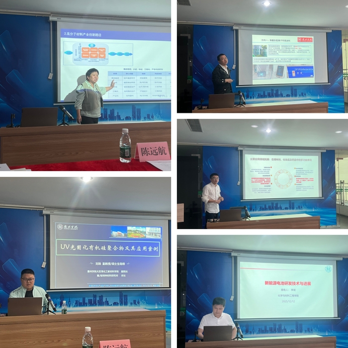 在企业分享环节,健立科技田总与真诚达谢总结合企业发展实际,分享了新材料研发与技术升级方面的经验与需求,表达了与高校深入合作、共同攻克技术难关的意愿。随后的博士成果推介成为活动亮点:肖定书副教授介绍了高分子材料概念验证中心的功能与服务;王子嘉博士聚焦烟用香精紫苏醛和巨豆三烯酮的产业化应用;申玉求博士、刘珠博士、李斌博士分别围绕功能高分子材料、UV光固化有机硅聚合物及其应用案例、新能源电池技术研发进展等前沿领域展开分享,内容涵盖技术原理、应用场景与产业化前景,为企业提供了丰富的技术参考与合作方向。
