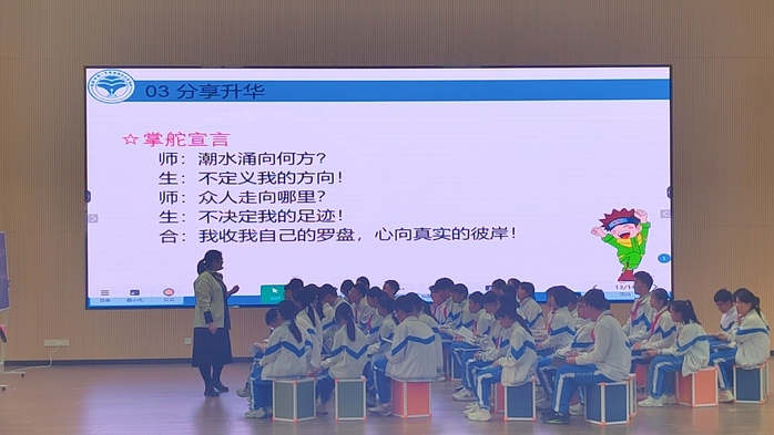 走进课堂,一场主题为《做自己的掌舵人》的班会正在热烈进行。课堂上,李蓓老师以趣味视频拉开序幕,引发学生对“跟风”与“自主”的初步思考。接着她通过情景模拟、小组讨论、分享方法、制作“过滤卡”等多元形式,鼓励学生主动规划人生航向,做自己的掌舵人。见习的同学们认真观摩记录,学习李蓓老师的课堂组织技巧与育人智慧,深刻体会班会课在学生思想引领中的重要作用。