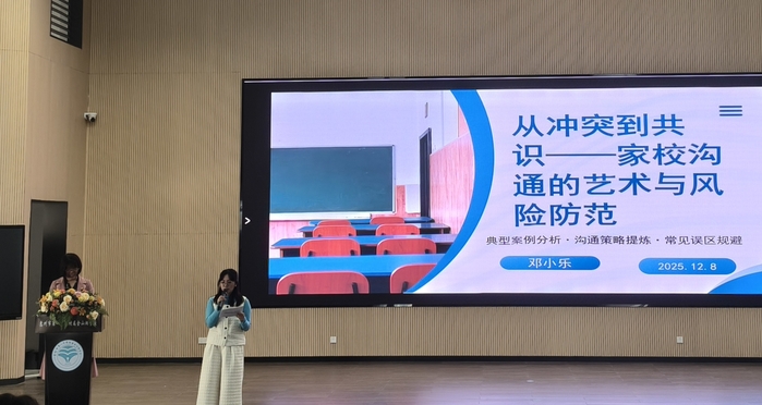 随后,同学们聆听了主题为《从冲突到共识——家校沟通的艺术与风险防范》的微讲座。主讲老师邓小乐首先阐释了家校沟通的重要性,点明了新时代家校关系的转变和沟通不畅可能引发的各类风险。紧接着,她结合推责型、高控型、价值观冲突型等六大典型家长沟通困境案例,逐一拆解应对方法,并提炼出“共情—澄清—建议—共识”的家校沟通四步法,还明确了家校沟通中的“雷区”与底线。最后,她引导听者实现从“沟通者”到“共建者”的思维转变,强调家校共育共同体的构建意义。精彩的分享让在场见习的同学们受益匪浅,对家校沟通的内涵与方法有了更为全面的理解。